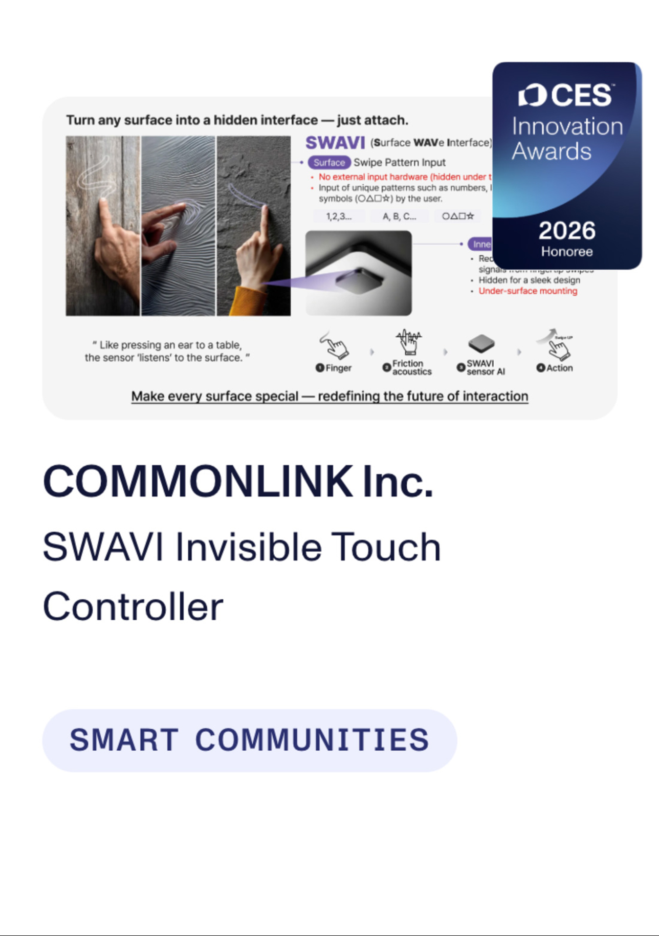 COMMONLINK holds a patent for sound-based machine learning gesture detection method and system, plus registered trademarks for COMMONLINK and SWAVI